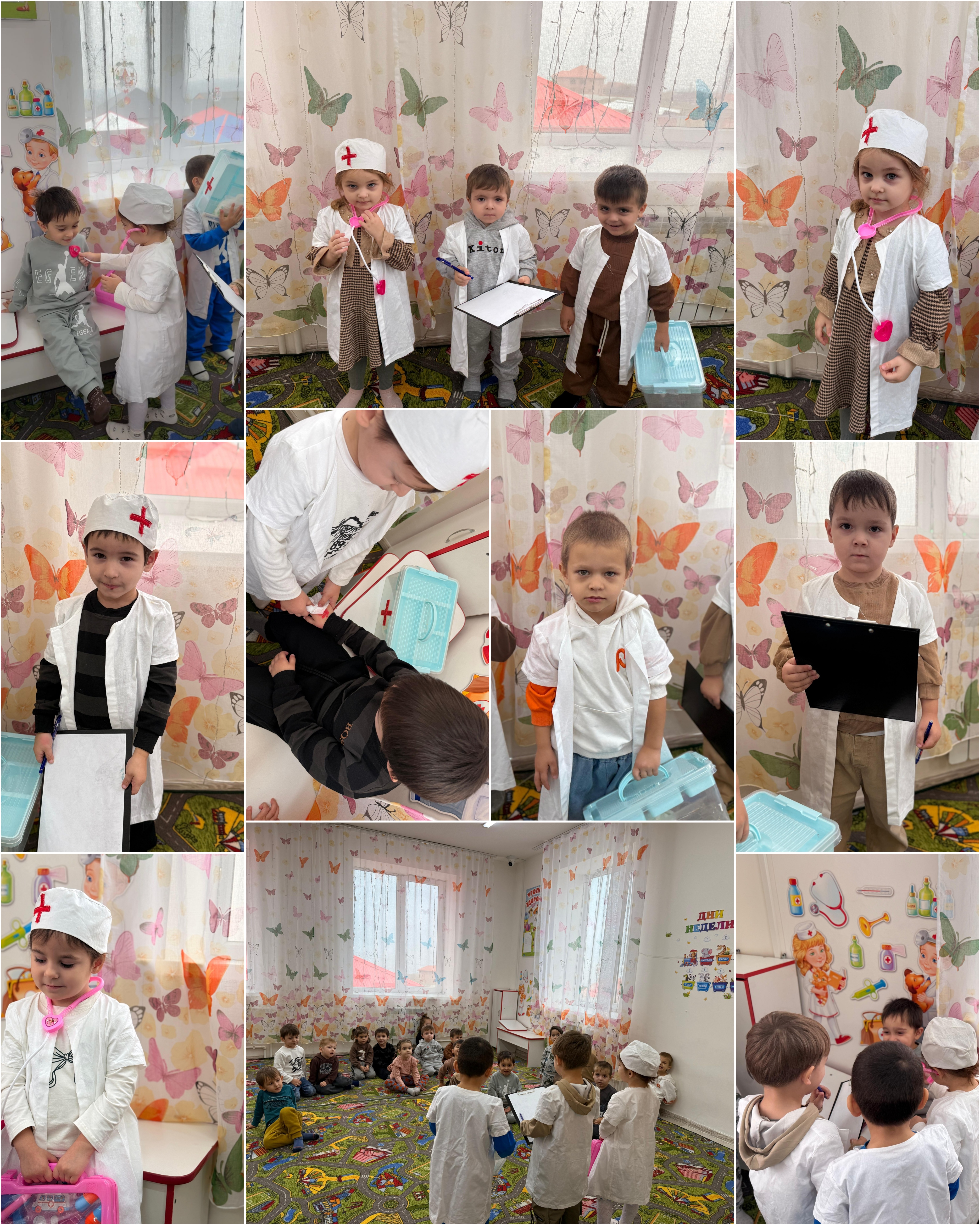 Тема: «Я — доктор» Цель: формировать у детей умение принимать на себя роль и выполнять соответствующие игровые действия, использовать во время игры медицинские инструменты и называть их; способствовать возникновению ролевого диалога.