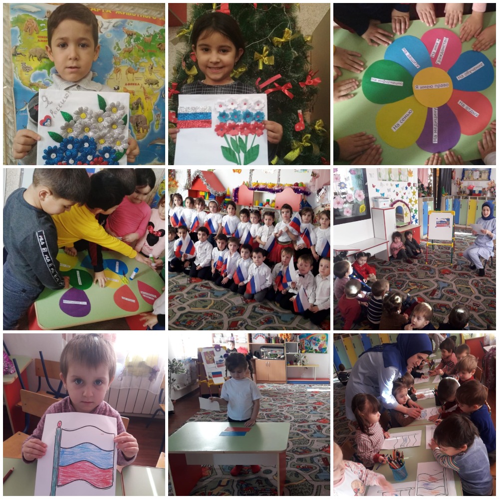 12.12.2019День Конституции - прекрасный повод для проведения занятия по нравственно-патриотическому воспитанию детей. Как бы то ни было, наш Основной Закон был и остаётся одним из основ Российского государства и объединяющих всех нас факторов. В нашем саду во всех возрастных группах прошли тематические мероприятия, приуроченных ко Дню Конституции РФ.Цель: дать детям элементарные знания и представления о Конституции Российской Федерации. Формировать элементарные представления о государственной символике.Задачи: познакомить детей с российским флагом, с символическим значением цвета и образов флага и герба России; воспитывать чувство уважения и любви к своей Родине; ознакомление детей с некоторыми правами: право на труд, право на отдых, право на медицинское обслуживание, право на образование; формирование основ правовых знаний; создание условий для понимания своих прав.