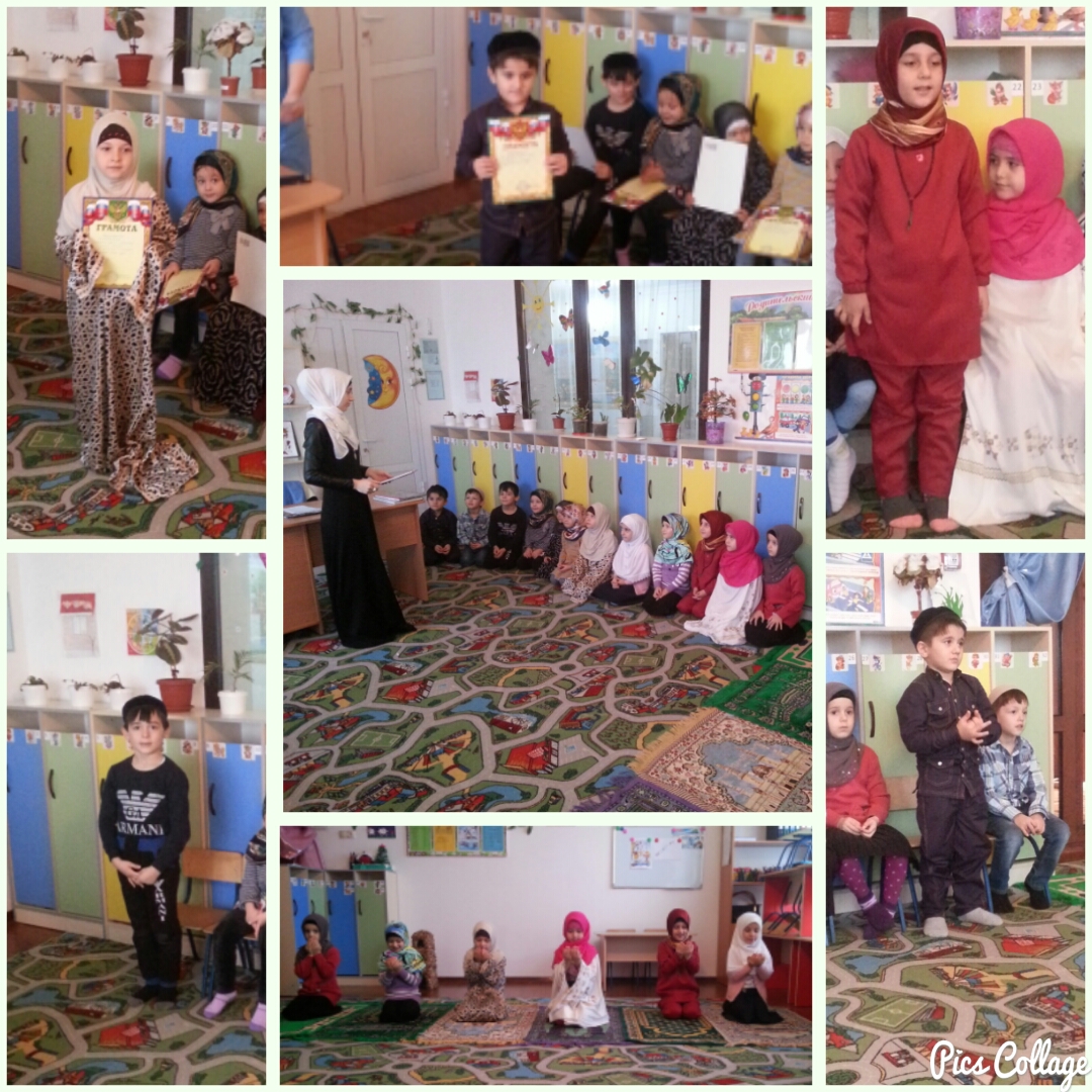 Наши занятия, проводятся в форме коллективного общения с внедрением активных развивающих игр. Таким образом, дети не только получают основы духовного воспитания, но и развиваются физически и умственно. С помощью наших занятий мы формируем в ребенке личность с четкими морально-нравтсвенными ориентирами, чтобы в будущем ребенок мог стать полноценным членом общества. Мы воспитываем детей в соответствии с чеченскими обычаями и традициями, прививаем им ценности истинного Ислама, чтобы они не стали заложниками ложных идей. Так, 19.01.2017 года, наш педагог дополнительного образования Мусхаджиева Ирайхан Абайдовна, подготовила и провела конкурс чтецов Корана, среди воспитанников средней группы "Звёздочки" и старшей группы "Радуга". Ребята продемонстрировали чтение суры Аль-Фаляк, Аль-Фатихат, Ат-Тахият, Ан-Нас, Кулха. Члены жюри в свою очередь оценивали знание текста, правильность чтения и красоту исполнения суры из Корана. После подведения итогов конкурса, трое воспитанников нашего сада заняли почетное 1-ое, 2-ое и 3-е место, всем остальным участникам конкурса, были вручены грамоты за принятие участия в конкурсе.