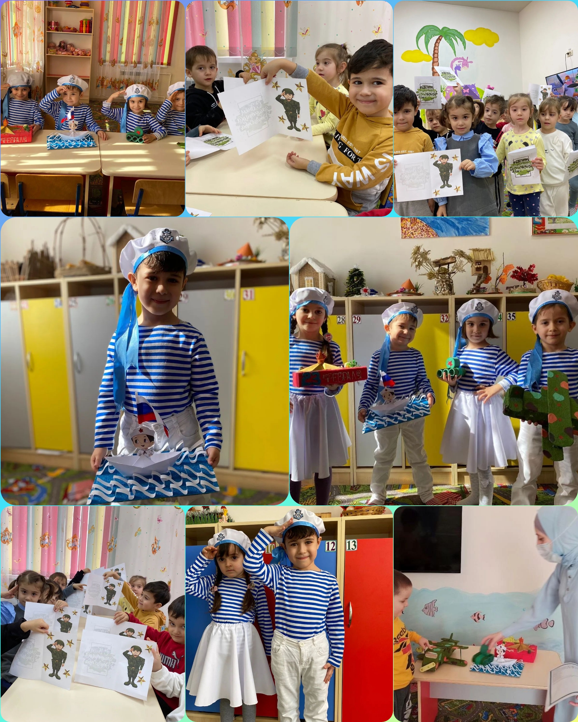 17.02.2022Тематические мероприятия ко Дню защитника Отечества в средней группе «Радуга». Цель: познакомить с Государственным праздником - Днем защитника Отечества, расширять представления о Российской Армии.Задачи:- создать радостное праздничное настроение у детей;- развивать социально-коммуникативные навыки, желание участвовать в тематических мероприятиях;- воспитывать в детях уважение к защитникам Родины;- закреплять знания о военных профессиях;- воспитывать патриотические чувства.Воспитатель А.М. Макаева