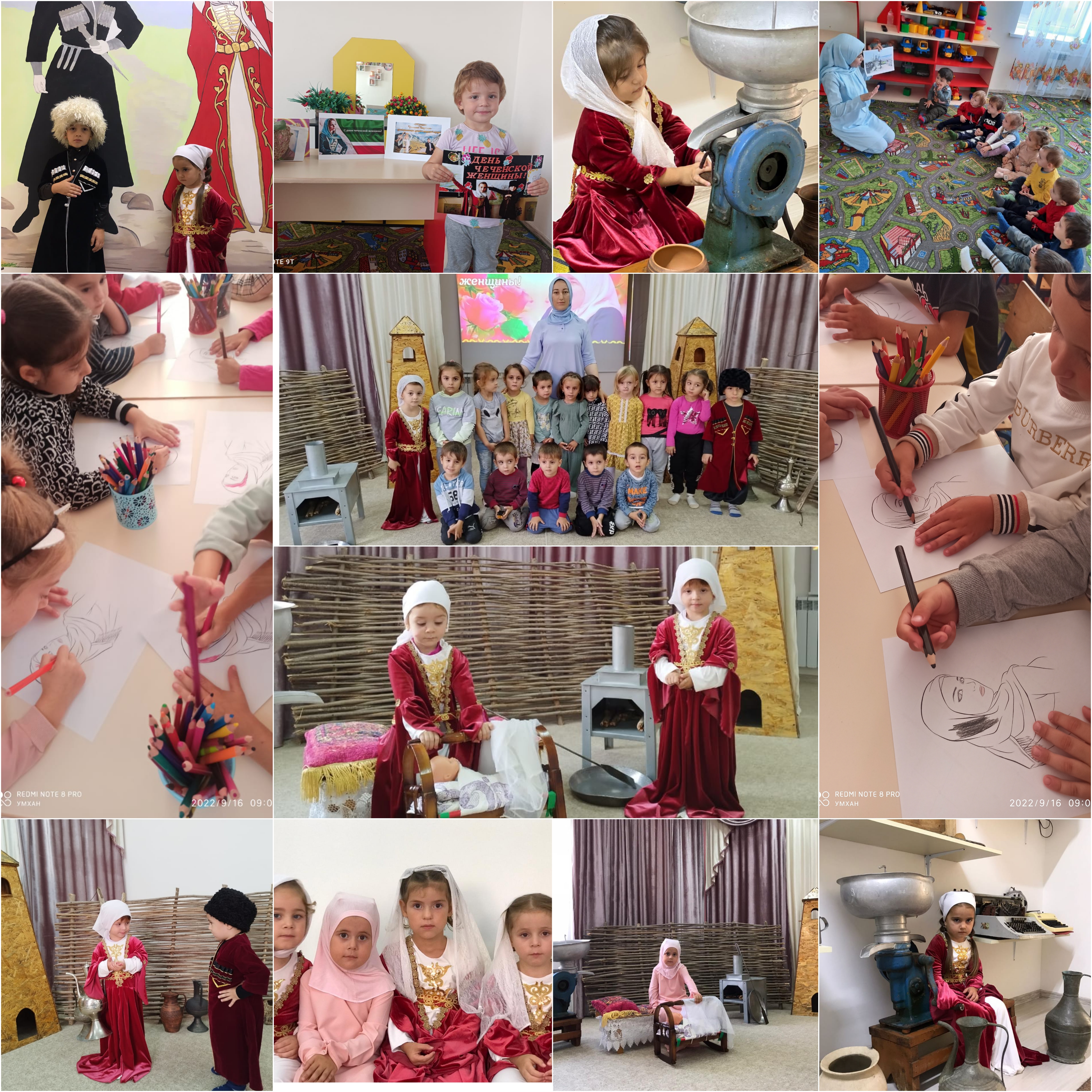 16.09.2022В эти теплые осенние дни вся Республика отмечает праздник - День чеченской женщины. Вот уже, который год подряд этот праздник является одним из главных праздников нашей Республики.День Чеченской женщины учрежден Главой Республики Рамзаном Ахматовичем Кадыровым, как «…дань уважения чеченским женщинам, которые во все времена на своих плечах выносили тяготы и лишения, связанные с трагическими событиями истории народа в прошлых столетиях, а так же в годы двух военных компаний». Чеченская женщина – это, прежде всего, мать. Лучшие качества нации передаются последующим поколениям от матерей.В целях воспитания уважения к женщине в нашем детском саду проведены ряд тематических мероприятий, приуроченных к празднику День чеченской женщины. Во всех возрастных группах были проведены тематические беседы, на которых воспитатели ознакомили дошкольников с историей данного праздника.