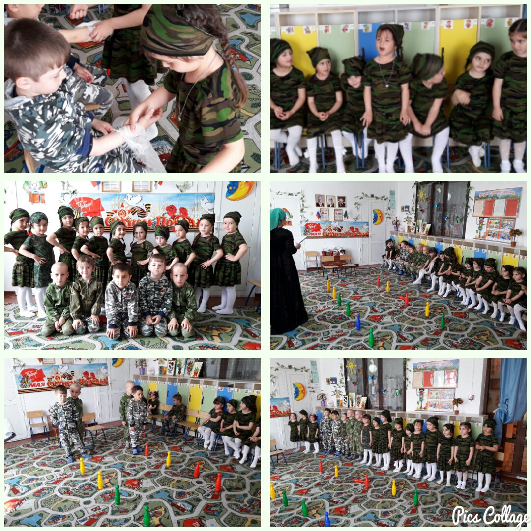 В целях патриотического воспитания дошкольников, формирования чувства патриотизма, любви к своей Родине и уважения к людям, которые ковали Победу, формирования положительного эмоционального подъема и формированности праздничной культуры, сегодня 5 мая 2017 года в средней группе «Звёздочки» прошел праздник, посвященный дню Победы. Предварительно с детьми в группах были проведены занятия, беседы о подвигах советских людей, в группах были оформлены выставки детских работ, оформлены родительские уголки, а праздник стал итогом этих мероприятия. Под руководством музыкального руководителя Дукуевой Марьям Магомедовна, воспитанники средней группы подготовили и показали праздничный танец, посвященный 9 мая, пели песни «День Победы», «Победный марш», «Пусть всегда будет солнце». А также соревновались в эстафетах «Военный врач» (перевязывание раненного) «Санитарки», «Марш-бросок». Дети вспомнили пословицы о силе, отваге, о солдатах, а так же вместе с педагогами исполнили песню военных лет «Катюша».