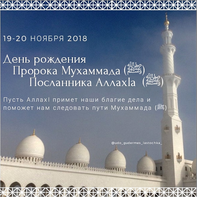 20.11.2018Искренне поздравляем всех мусульман с замечательным и поистине великим праздником - День рождения Пророка Мухаммада(ﷺ). Желаем мира, добра, здоровья, крепкой веры, душевного умиротворения, силы духа, чистоты помыслов и успехов во всех добрых начинаниях!