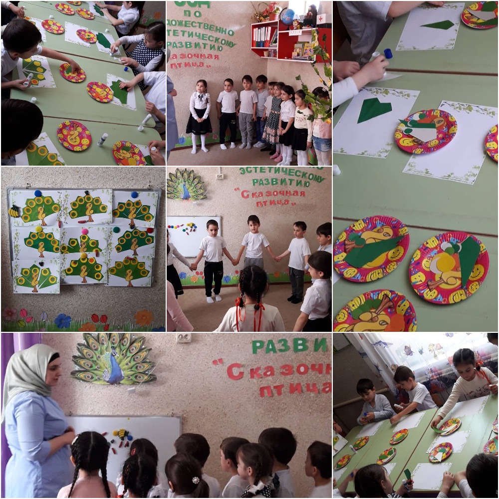29.03.2019ООД по художественно-эстетическому развитию, провела воспитатель старшей группы «Радуга» Салмахаджиева У.Э. на тему «Сказочная птица» (аппликация). Цель: Умение вырезать части предмета разной формы, составлять из них изображение.Задачи:- учить передавать образ сказочной птицы, передавая ее необычность и яркость;- развивать воображение, активность, творчество;- вспомнить и познакомить детей с названиями птиц и частями их тела;- продолжить расширять кругозор детей, пополнять их словарный состав;- воспитывать аккуратность, усидчивость.